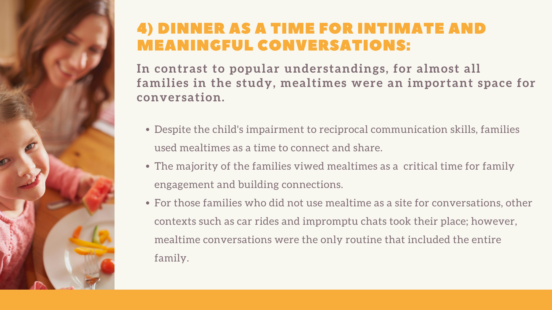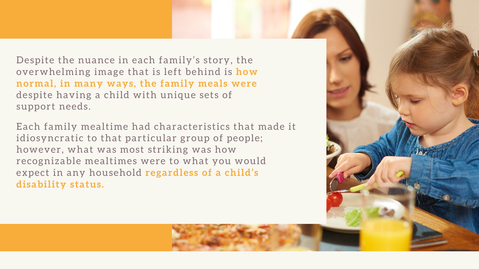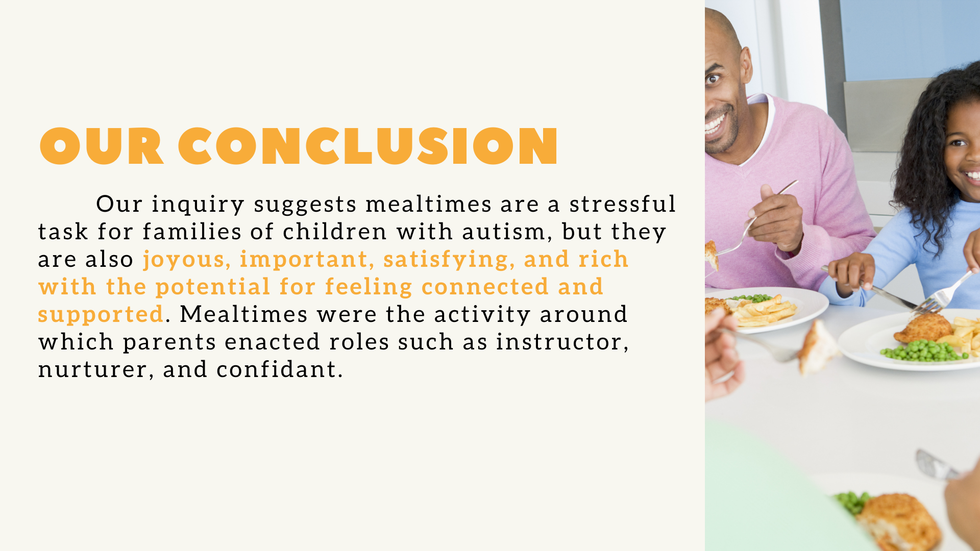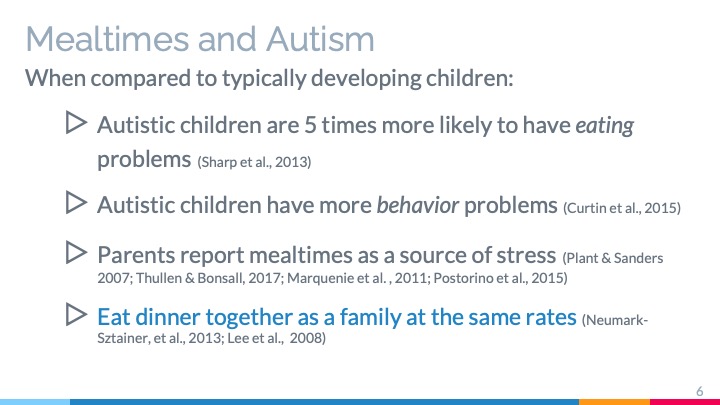 Curtiss, S.L. & Ebata, A.T. (2019). The nature of family meals: A new vision of families of children with autism. Journal of Autism and Developmental Disorders, 49(2), 441-452. https://doi.org/10.1007/s10803-018-3720-9
