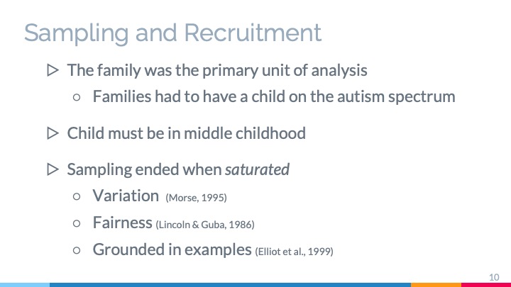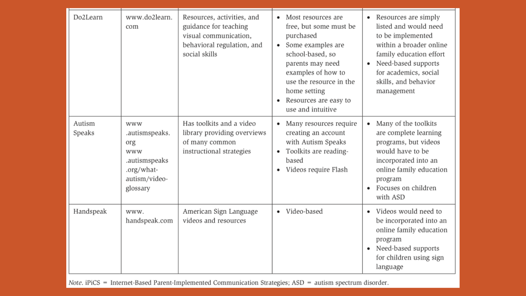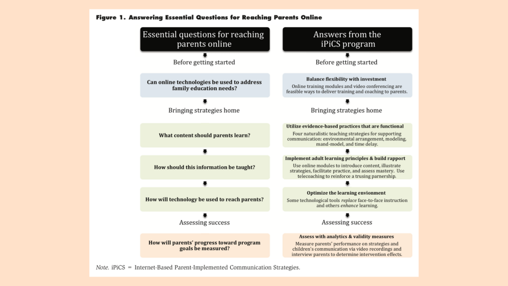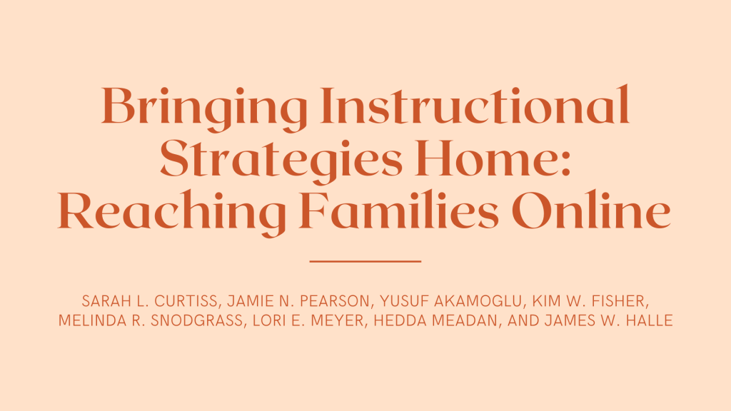 Curtiss, S.L., Pearson, J.N., Akamoglu, Y., Wolowiet-Fisher, K., Snodgrass, M.R., Meyer, L.E., Meadan, H., & Halle, J.W. (2016). Bringing instructional strategies home: Researching families online. Teaching Exceptional Children, 48(3), 159 – 167. https://doi.org/10.1177/0040059915605816